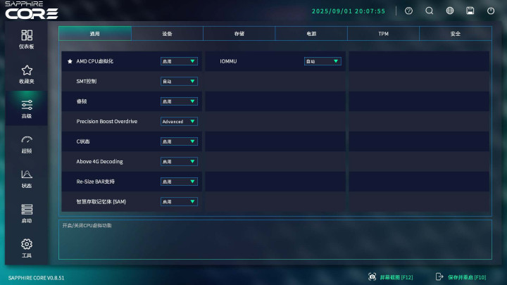▼“高级”菜单中,原有的多层级选项被重组为通用、设备、存储、电源、TPM 及安全六大逻辑类别,其下属选项均在 二 级菜单中完整呈现,摒弃了传统 BIOS 繁琐的层级导航,使得配置过程更为直观、高效。