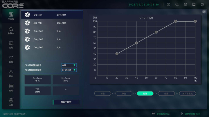 ▼风扇管理界面可以对每个已连接的风扇进行精细化的独立调速。此外,为简化操作,软件内置了四种预设风扇模式,方便用户根据需求 一 键切换,无需进行复杂的手动设置。