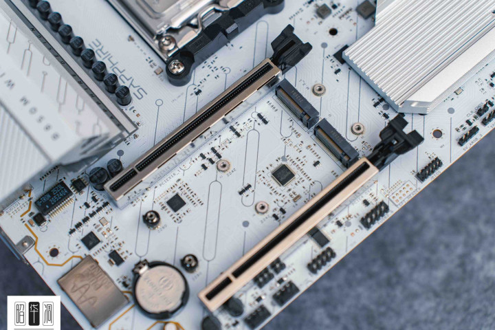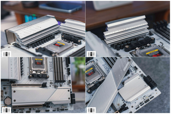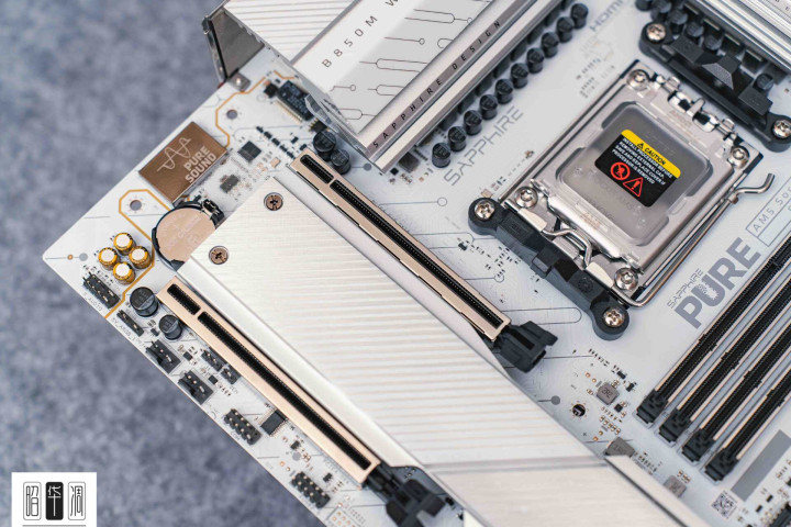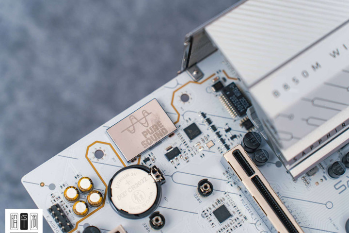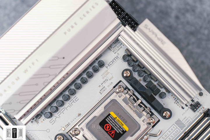 ▼在蓝宝石的产品阵营中,PURE 系列基本就是高颜值高性能的代名词。主板采用标志性的纯白 PCB ,颜值到位,大面积覆盖的极地散热装甲能高效带走核心元件的热量,确保高负载下依然稳定运行。装甲上细腻的拉丝金属工艺与动感线条交织辉映,完美融合了未来科技感与实用主义,尽显高端风范。