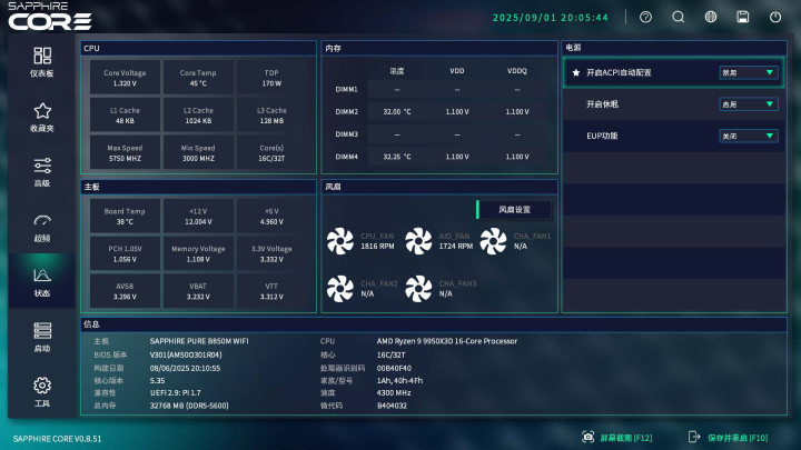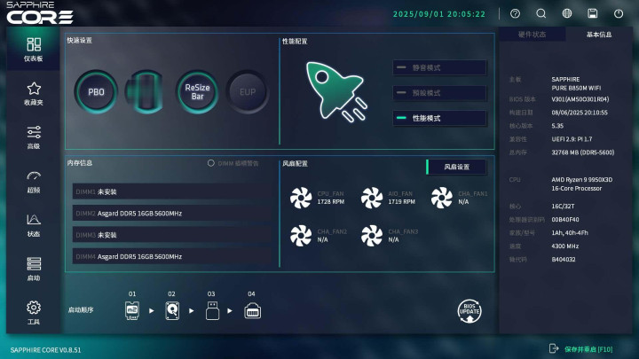 不过近期蓝宝石开始启用新版 BIOS(Sapphire Core ) ,不仅是界面更具时尚感,调试也更加直观高效,本次就利用 锐龙9 9950X3D + 蓝宝石 PURE 极地 B850M WIFI 主板+ RX 9060XT 16GB 极地显卡这套组合,测试下新版 BIOS 加持下的性能表现。