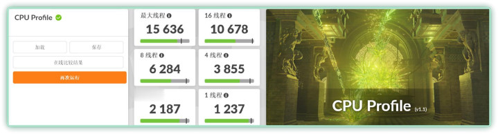 ▼CPU PROFILe 是 3D mark 针对 CPU 基准推出的测试,主要用于显示CPU性能如何随使用的内核和线程数量而变化,也就是多线程在实际运用中的性能表现。测试结果:单线程 1237,最大线程 15636 ,和 X870 平台表现差不多。