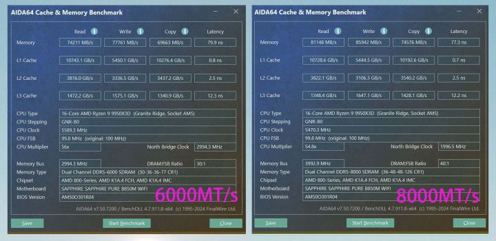 ▼AMD 平台比较吃内存效能,所以甜品区间在 6000MT/s ~ 6400MT/s 之间,再往上就是分频模式,内存测试这里利用阿斯加特博拉琪 II DDR5 内存条进行,自带的两套 EXPO 预设正好对应定频 / 分频模式,结果如下