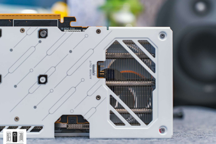 ▼全尺寸金属背板不仅提升了整体的质感与结构强度,还能辅助导出 GPU 核心热量。卡身右侧的镂空设计与内部的 三 根复合热管及加厚鳍片相配合,形成了高效的“对穿式”气流通道,能最大限度地将热量排出机箱。