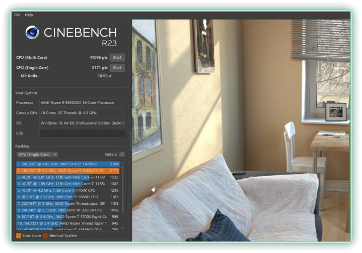 ▼在衡量专业生产力性能的标杆软件 Cinebench R23 中,它取得了单核 2171分、多核 41096分 的成绩。