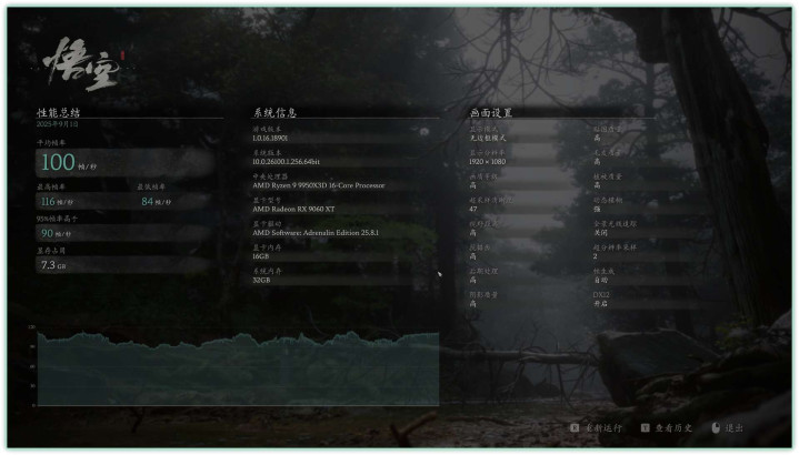 ▼黑神话.悟空在 1080P 分辨率 + 高画质 + 帧生成 ,帧率达到 100FPS ,最低帧率 84FPS,95% 以上场景都能达到 90FPS 以上