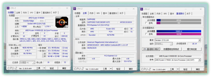 ▼测试使用的处理器为 AMD 锐龙9 9950X3D ,并在 BIOS 中开启 PBO 自动超频选项,在 CPU-Z 测试中,这套平台跑出了单核 872、多核 15821 的分数,