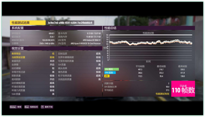 ▼地平线5 应该算是 Windows 平台优化最好的赛车游戏,画面表现也是相当不错,本次测试基于 2K 分辨率 + 极端特效,实测下来平均帧率达到了 110FPS