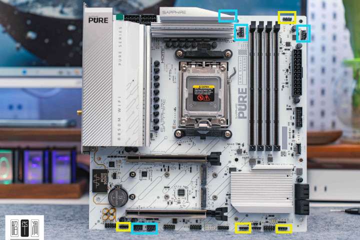 ▼板载插口方面接口主板也给的很足,散热方面提供了 1 个 CPU 风扇插针、3 个系统风扇插针、1个水冷泵插针;灯光方面则是提供了 3 个 5V 3-pin ARGB 插针、1 个 12V 4-pin RGB 插针,位置也是上下覆盖,确保装机走线的便利。